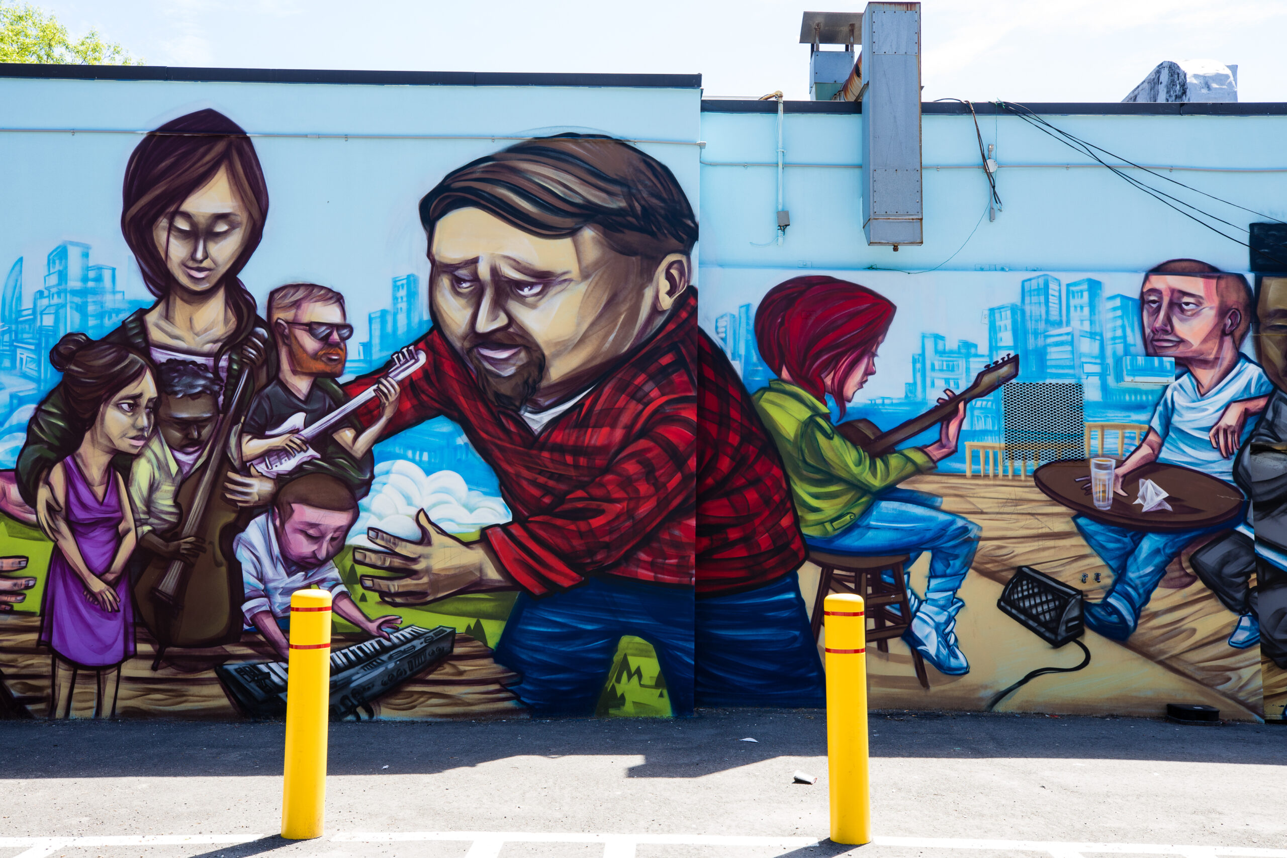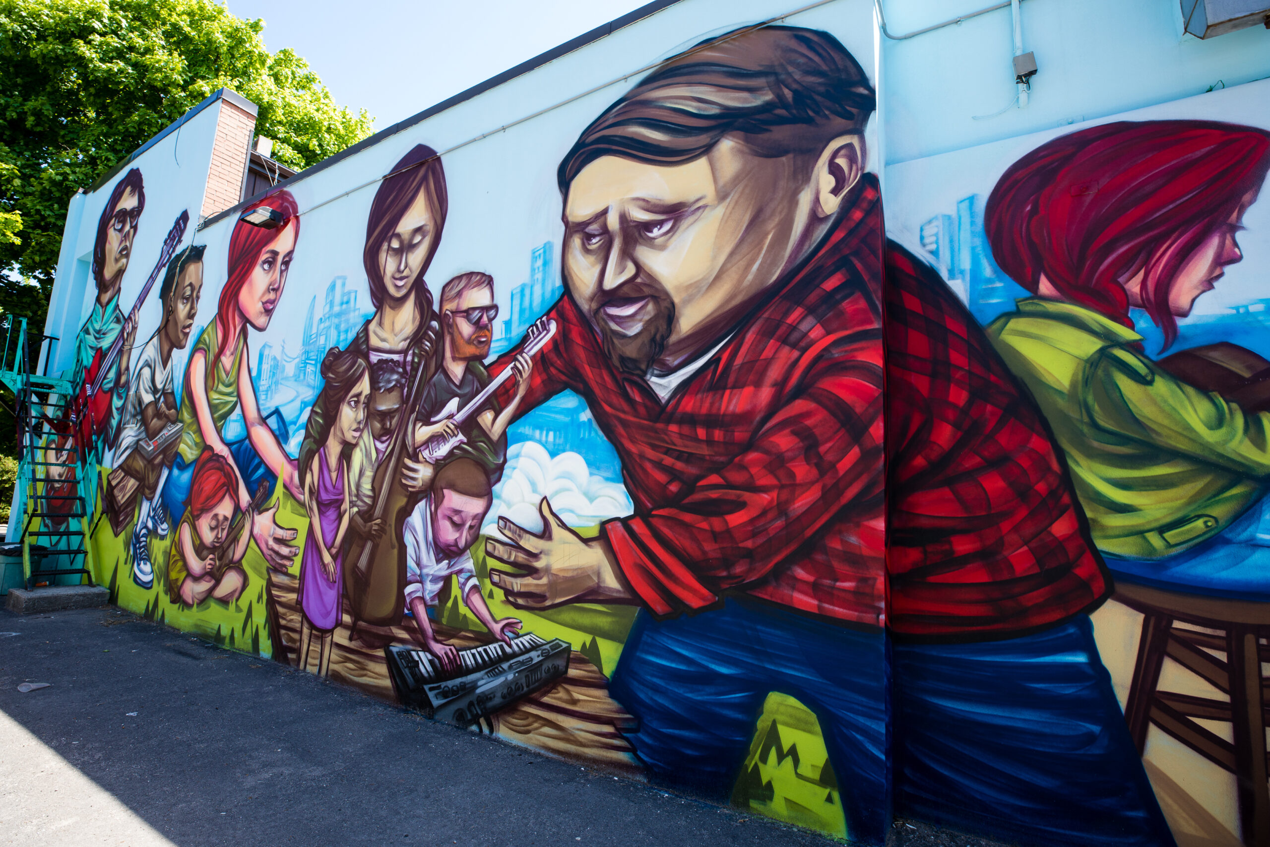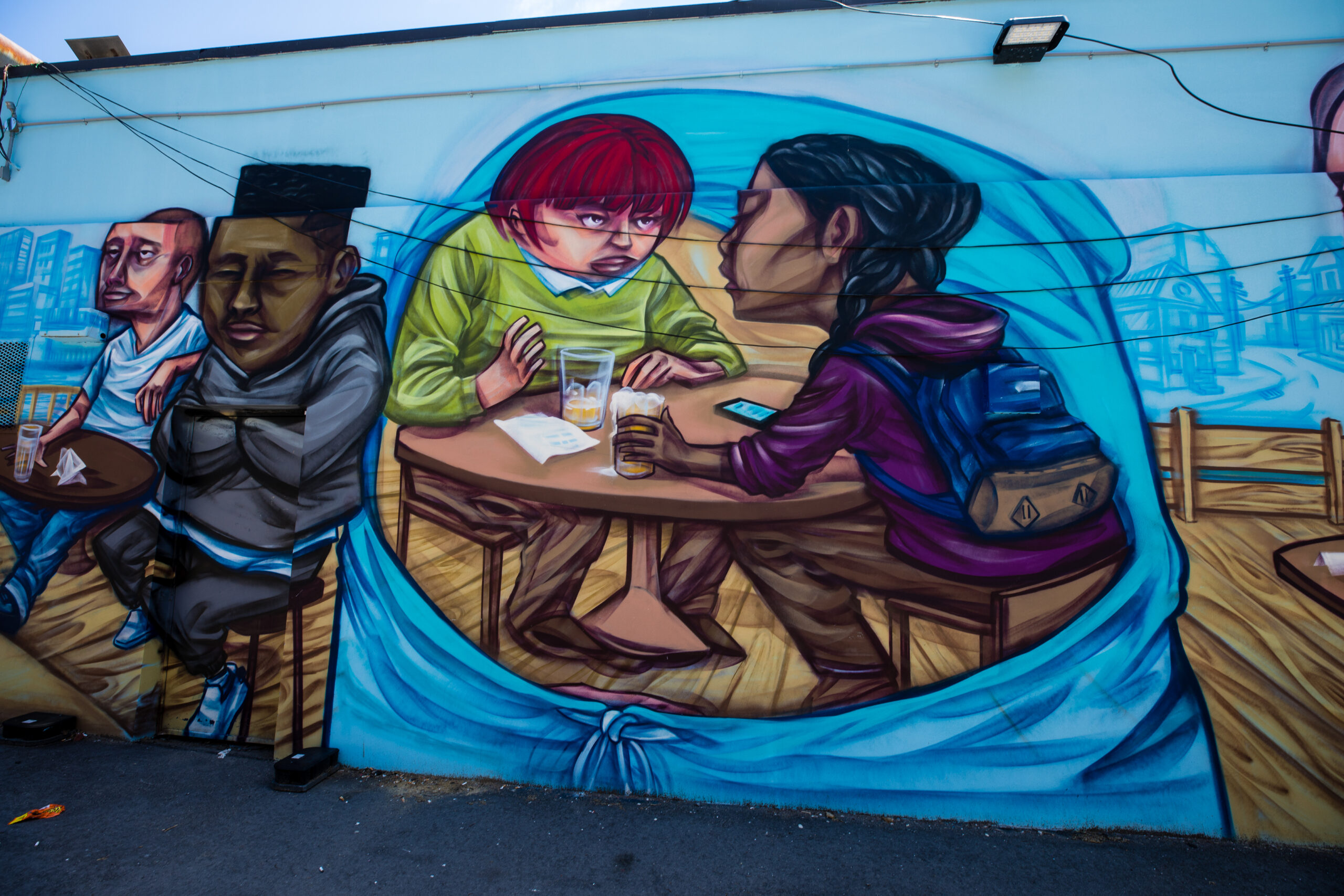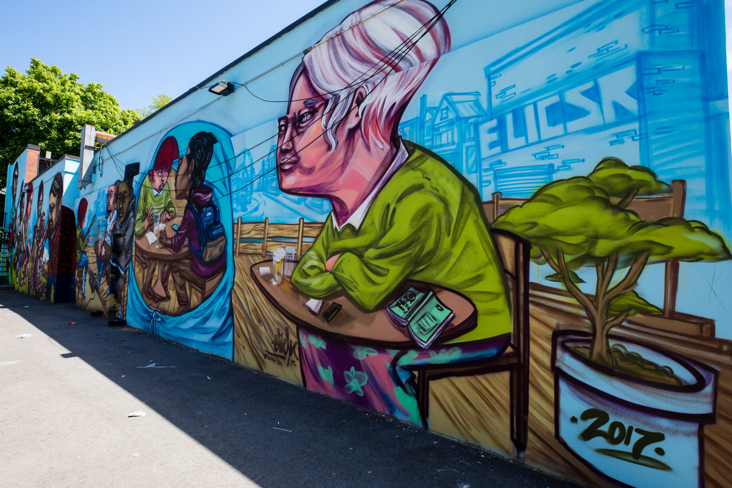 Mural by Elicser. In Barbara Barrett Lane, just south of Bloor Street West, running between Borden Street and Brunswick Avenue.